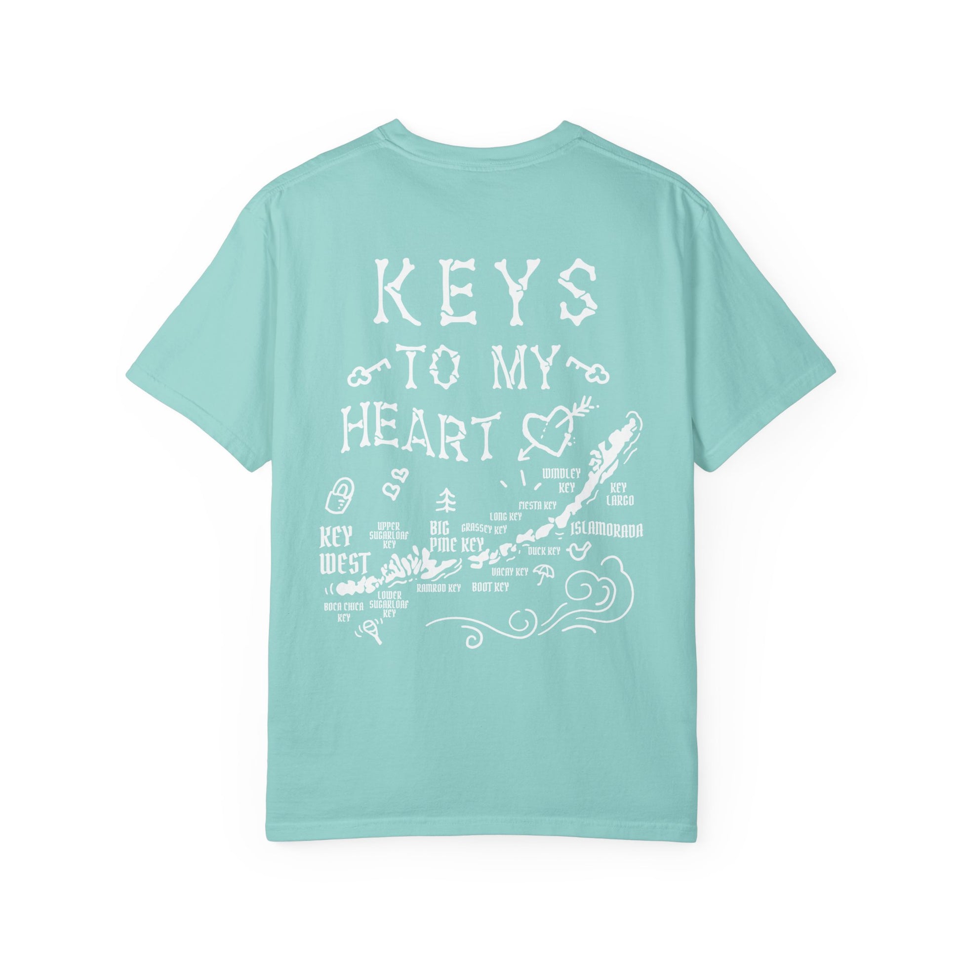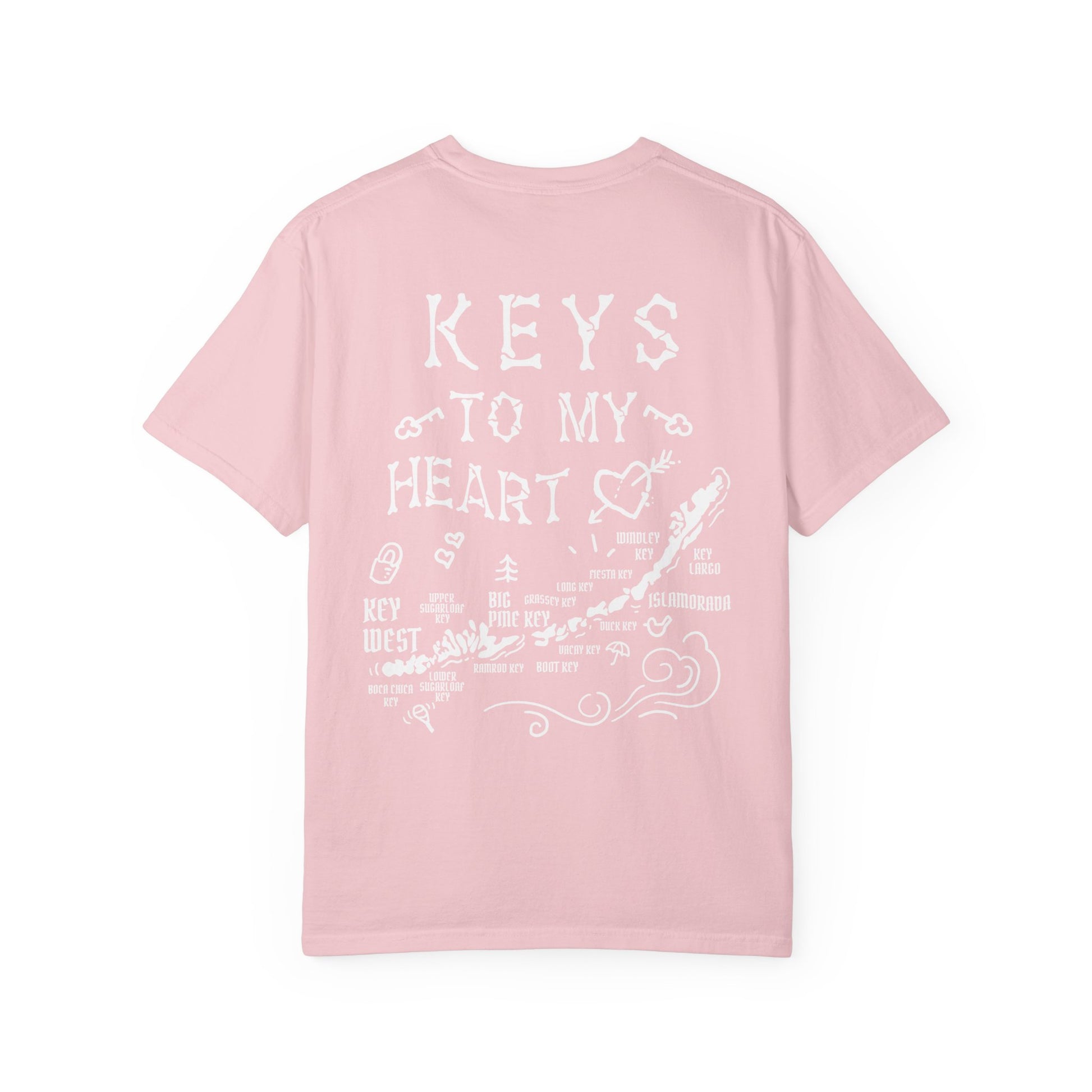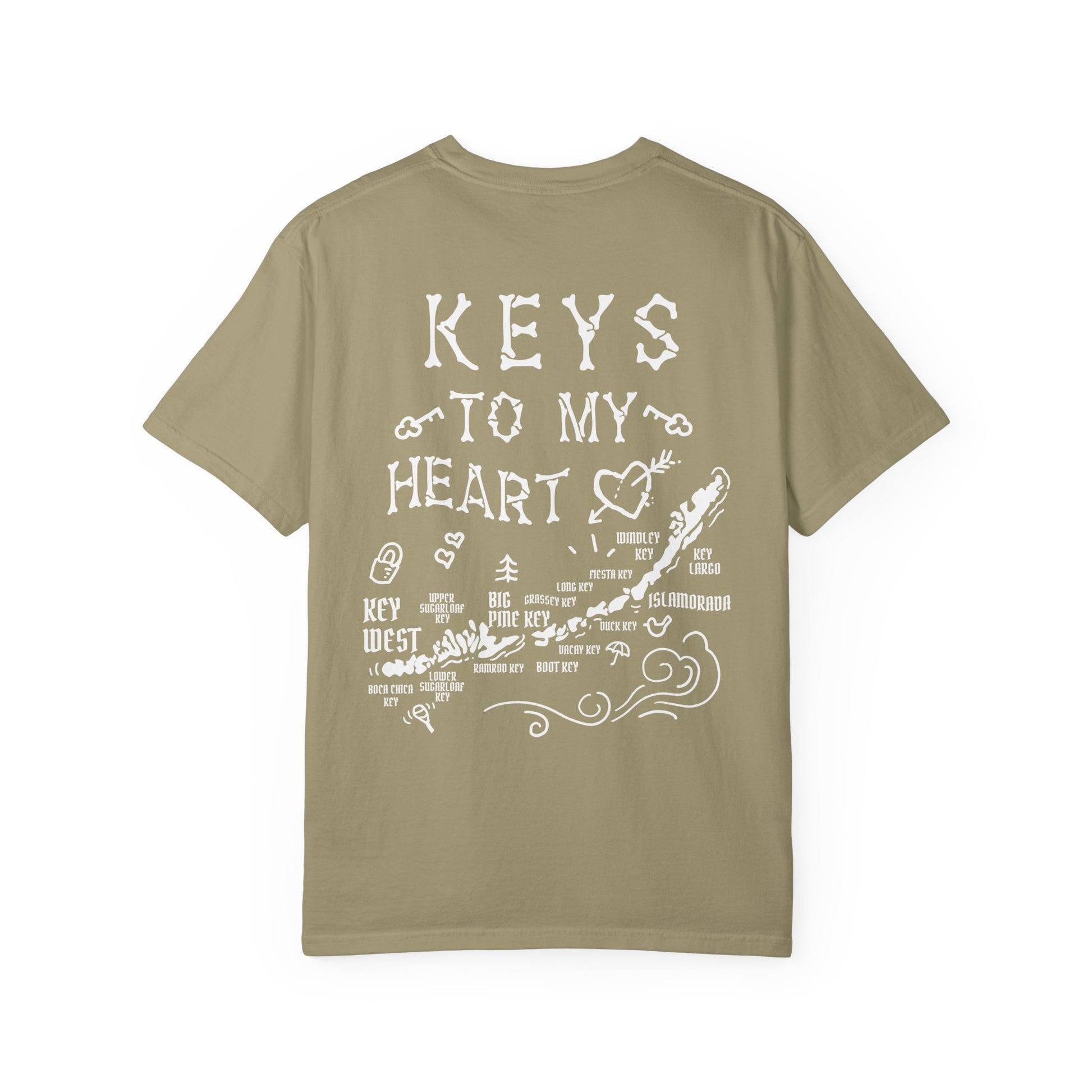 This Florida Keys themed T-shirt features a design that says 'keys to my heart'. The relaxed fit and soft, garment-dyed fabric provide a laid-back and comfortable vibe, perfect for casual wear. Ideal for those who love Florida Keys or as a gift for a loved one during Valentine's Day or anniversaries.